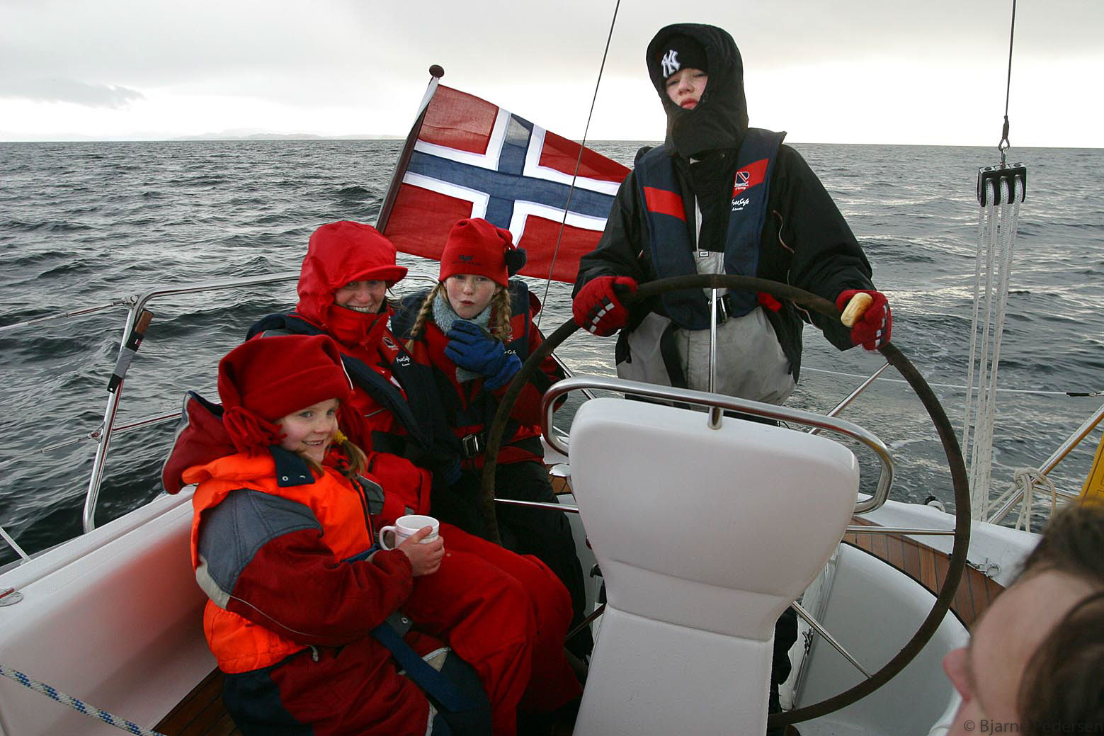 En frisk bris setter fart i båten. Mannskapet er årvåken og på vakt. Tina står til rors og Marius (14) følger spent med når Ørjan kaster "Øvingsmannen" over bord igjen. Under den innledende treningen ble to blåser brukt som markør.