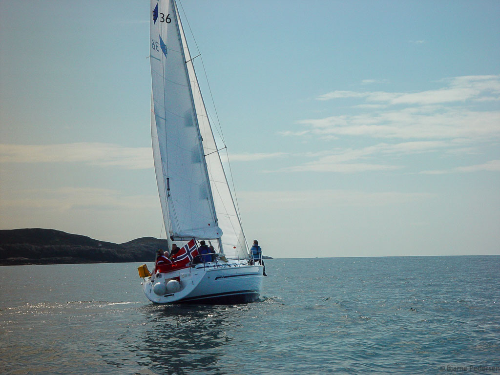 Etter en god natts søvn kastet vi loss og seilte ut. Også denne dagen var det nydelig vær for seiling, 13 grader og 4 m/s fra sørvest. Når det er mer enn en båt på fjorden blir det alltid regatta enten du vil eller ikke. Skiprene Kjell og Bjarne på hver sin båt var i alle fall i regattamodus. Det foreligger ingen resultatliste for seilasen som gikk fra Sotra, rundt Marsteinen og tilbake til Milde.