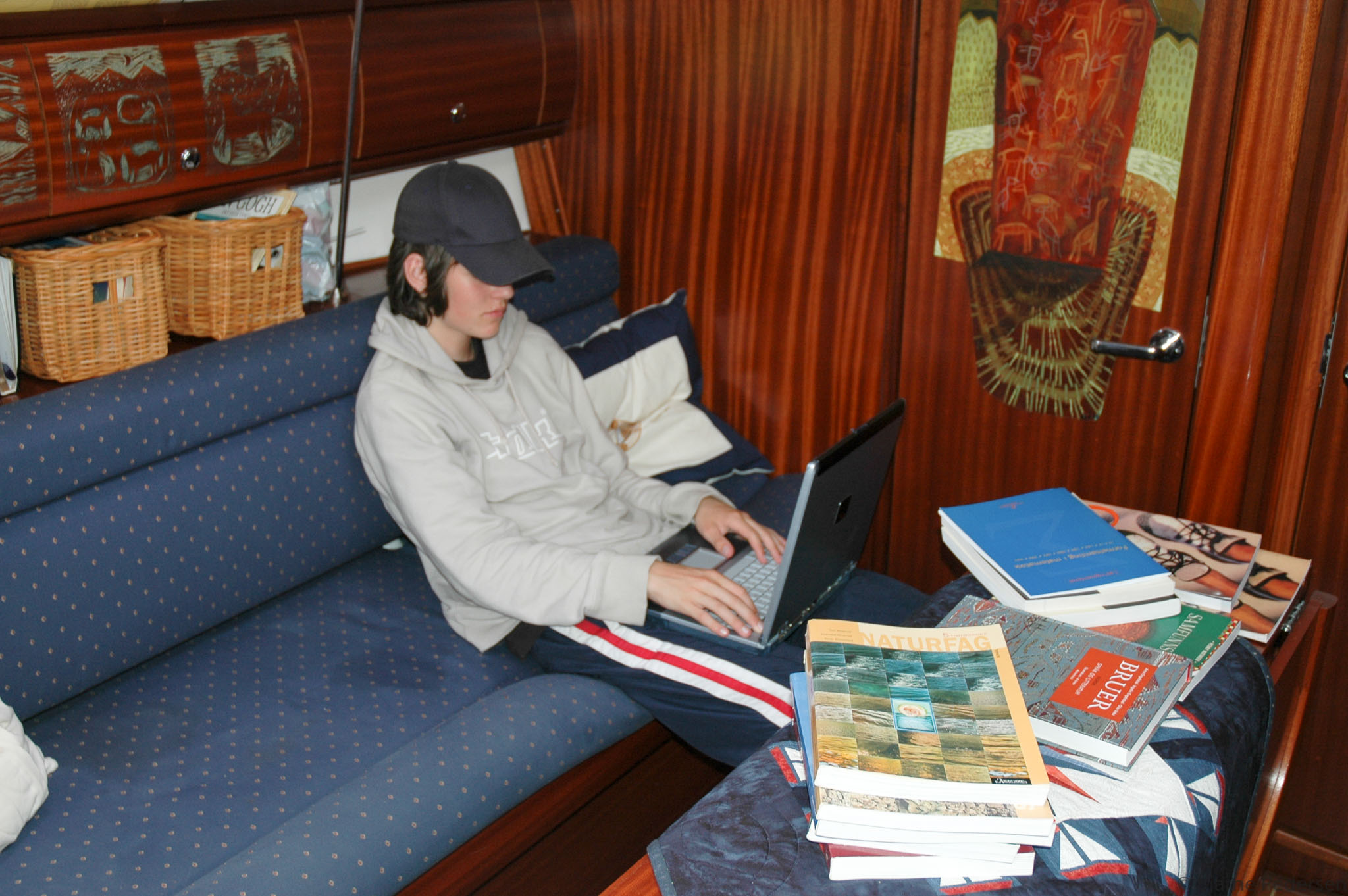 Vi begynte å planlegge gjennomføringen av skolen ombord sist vinter. Fra Oda og Anja sin skole, Minde Skole, har vi fått verdifull hjelp i form av lærerplaner og råd og veiledning. Skolen har også lånt ut alt vi trenger av bøker for dette skoleåret. I tillegg har min søster Turid, som er lærer i Langesund, lånt oss læreplanen L97 og bidratt med lærerplaner.