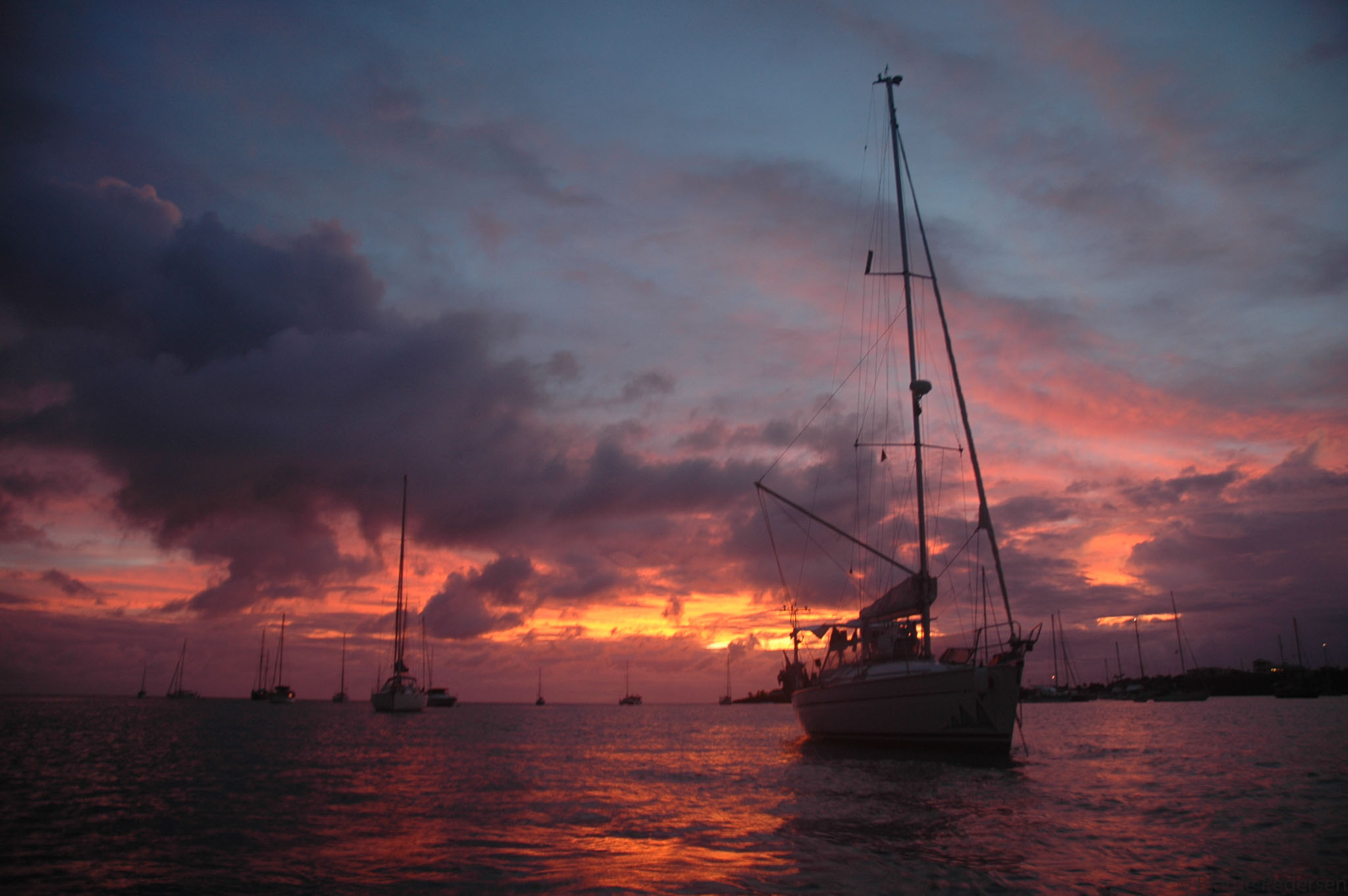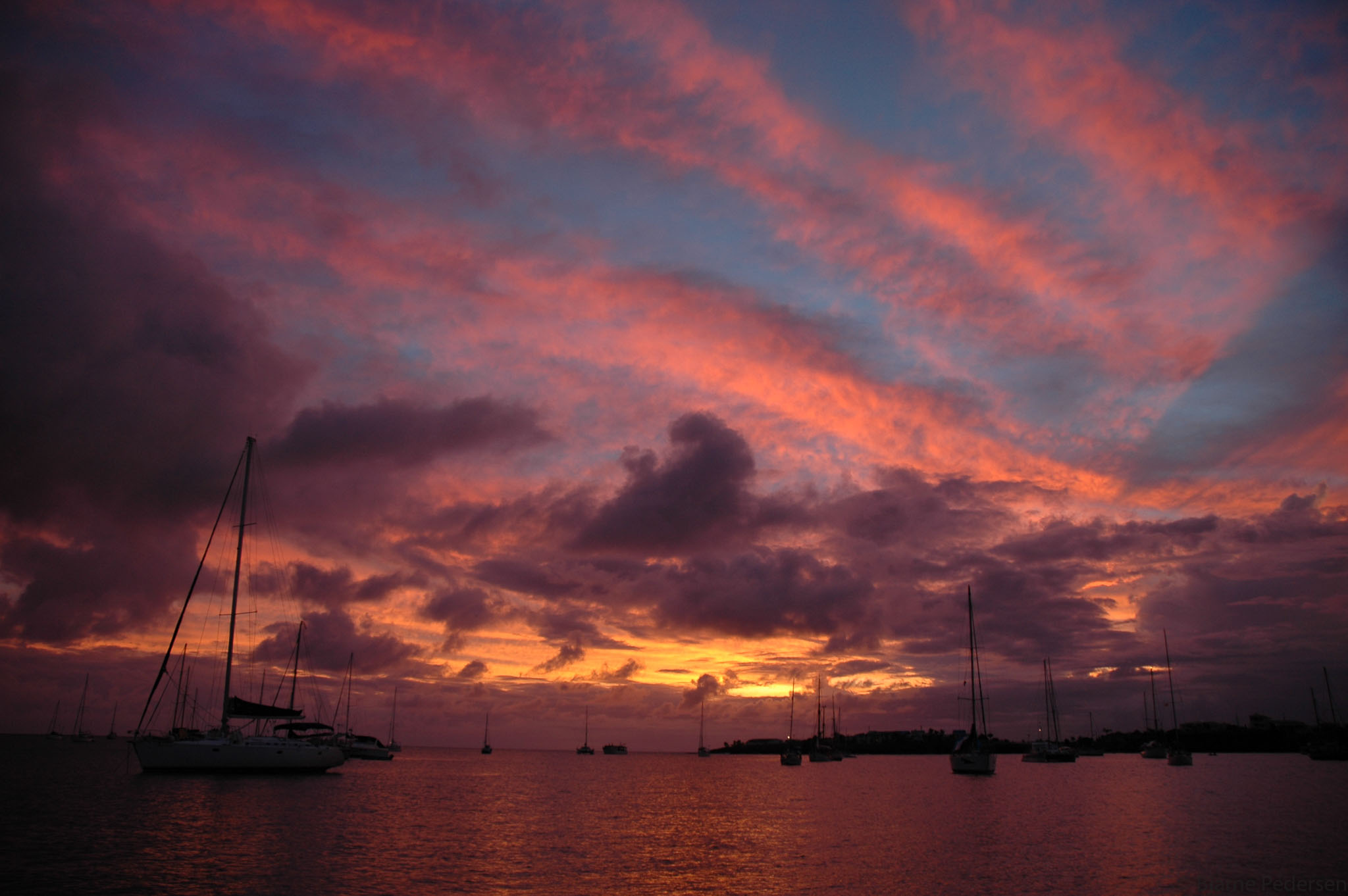 Tankene spretter lekent fram og tilbake, streifer tilbake fra det regnfulle og kalde vestlandet til seilasen som skal gjennomføres i morgen. Drøye førti mil skal tilbakelegges før vi når sydenden av Grenada. Håper vinden holder seg. Det blir nok en fin seilas med vind aktenfor tvers. Vi kan nok sette opp spriseil i morgen. Vi kommer til å gjøre god fart med storseilet på le side og forseilet tvunget ut mot lo med spinnakerbommen, så de førti milene er nok unnagjort i en fei.