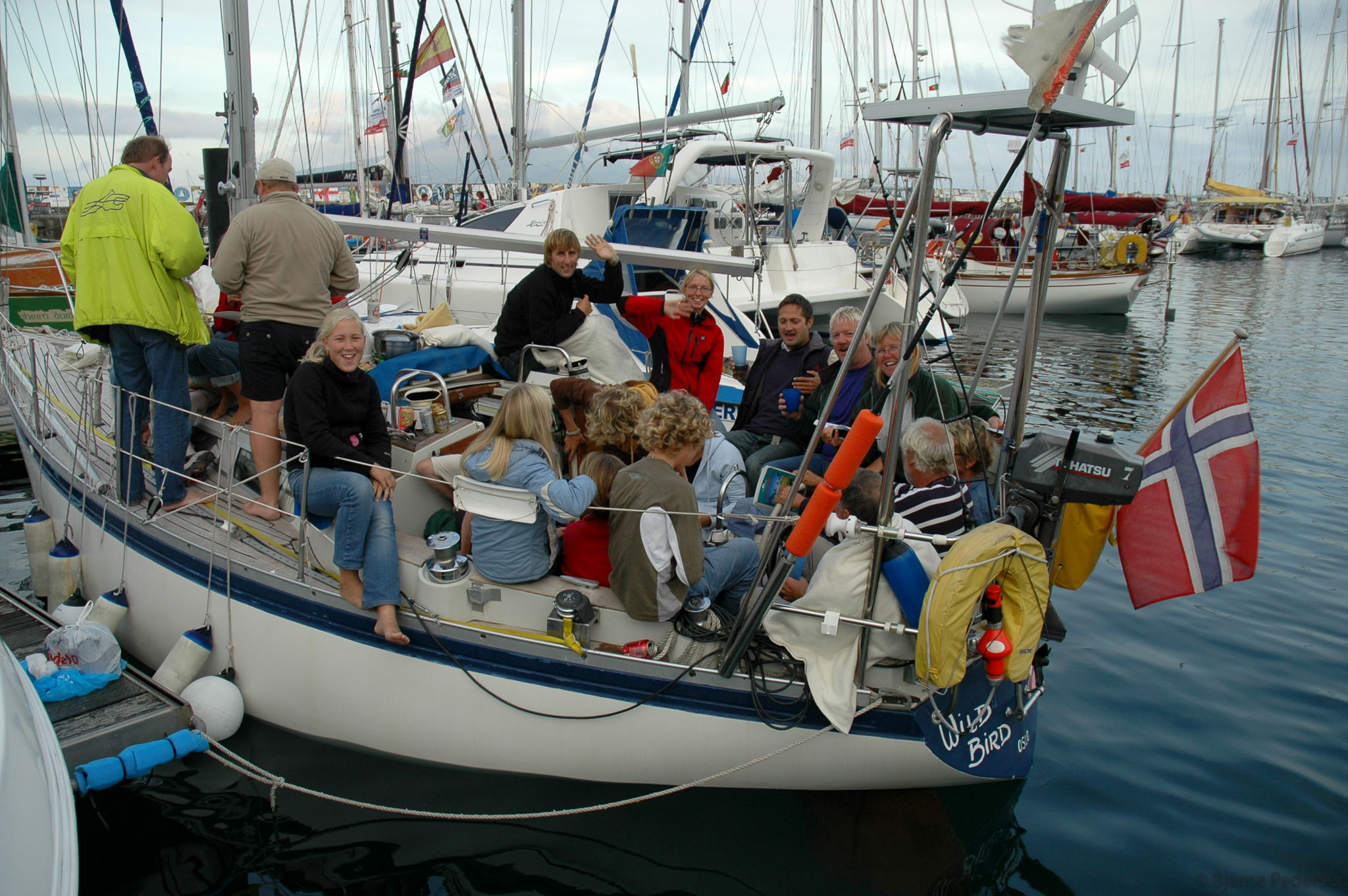 Villfuglene Line og Jørgen inviterte deretter alle skandinaver til pannekakekveld ombord. Stakkars Line stekte over 100 pannekaker før alle sammen ble mette. Jeg ville nok ha slitt litt med å steke så mange pannekaker, men Line hadde smilet på plass hele tiden. Med alle gjestene vel ombord i cockpiten, ble båten så tungt lastet at vannet kom inn gjennom lenseåpningene i cockpiten. Ingen grunn til å klage, det var jo bare å ta av seg på beina. Men det hadde neppe vært å anbefale å kaste loss med så mange personer ombord.